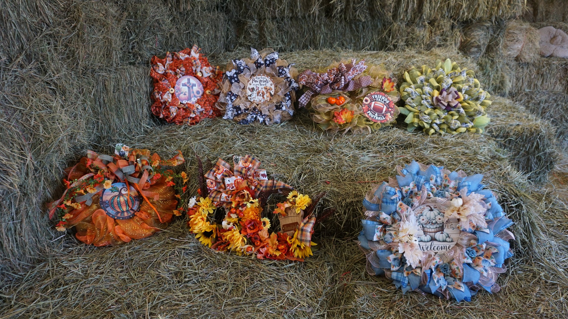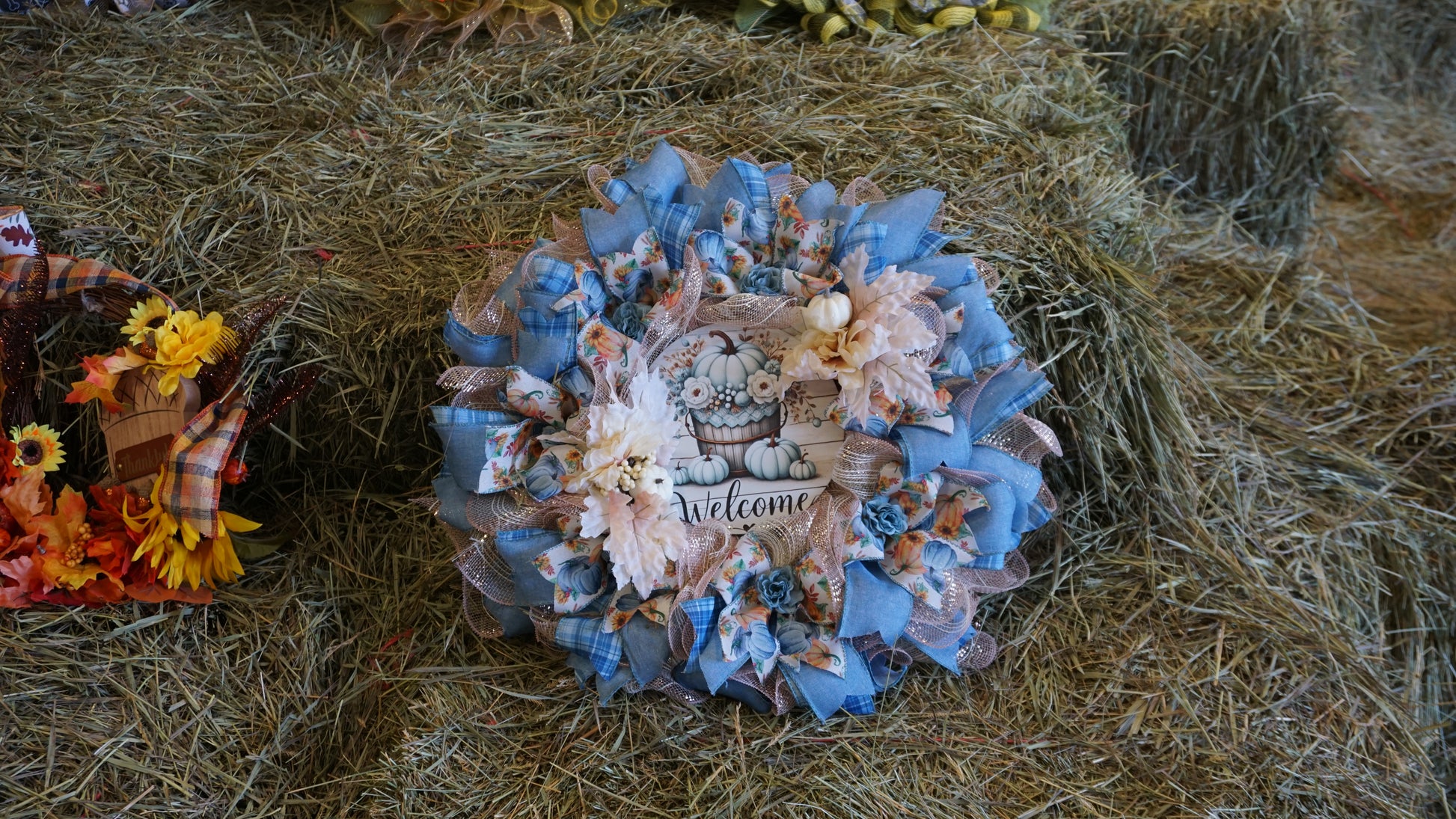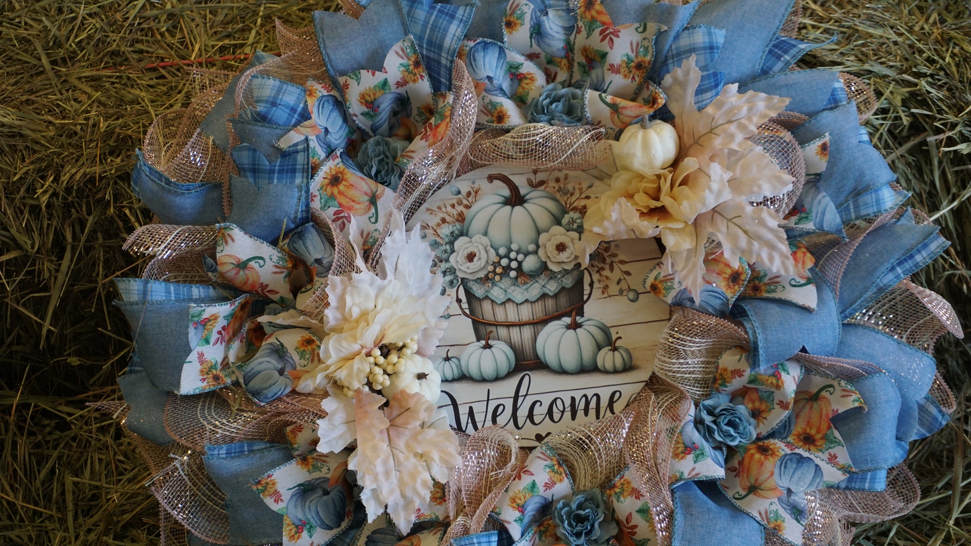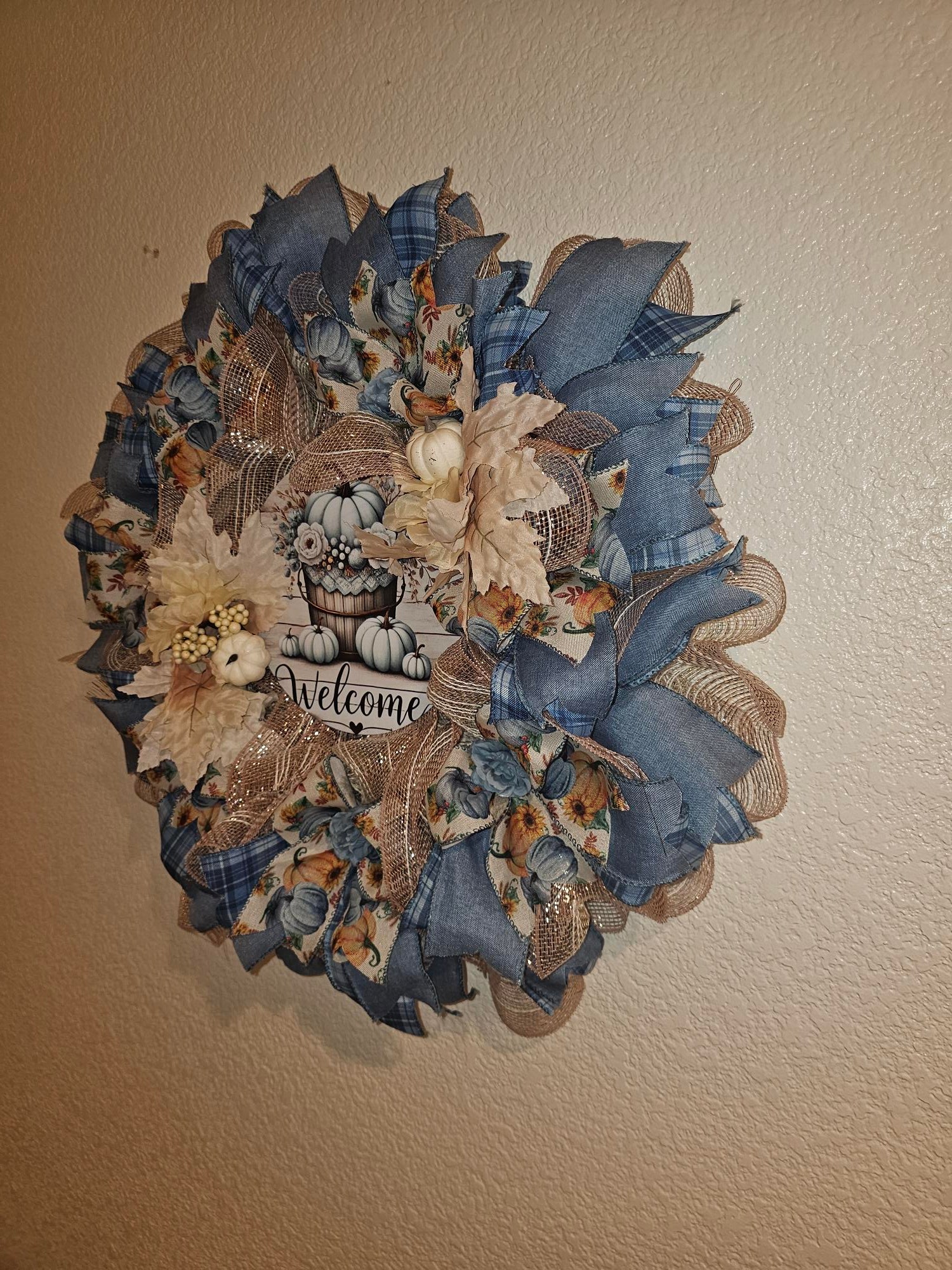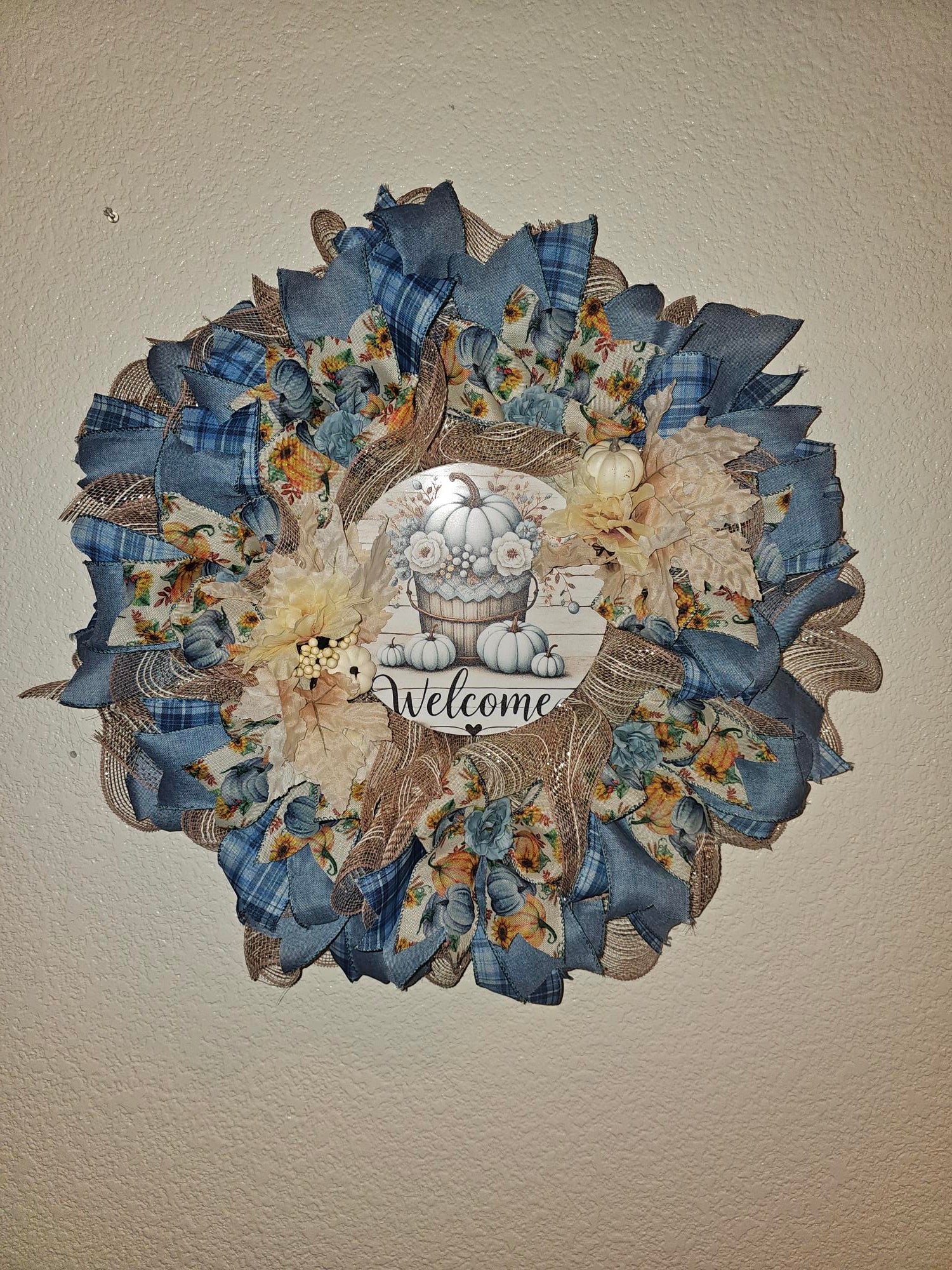 Welcome the season with this one-of-a-kind fall wreath! Featuring soft blue plaid ribbon, sunflower accents, creamy florals, and a charming farmhouse-style “Welcome” sign, this wreath adds the perfect rustic touch to your front door or entryway.