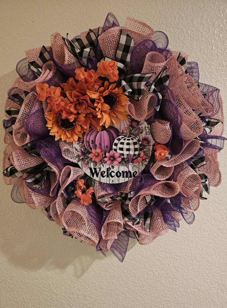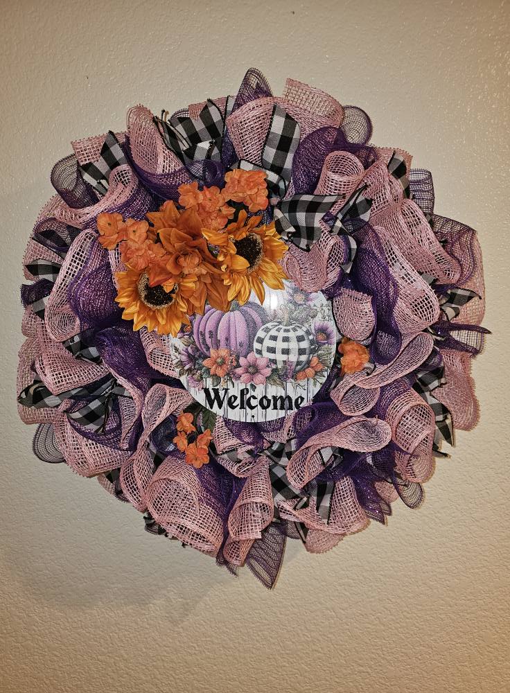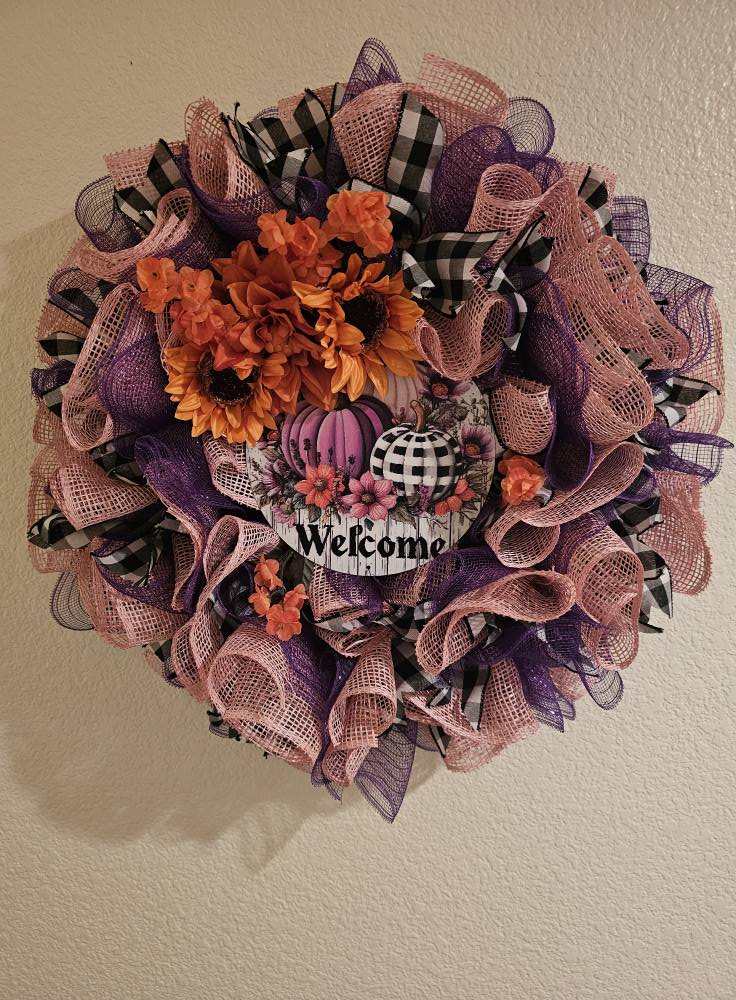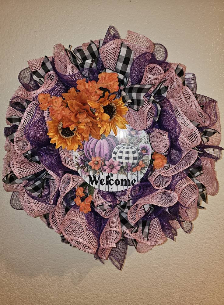 Welcome the season in style with this handcrafted Purple Fall Welcome Wreath! Featuring vibrant orange sunflowers, playful pumpkins, black-and-white buffalo check ribbon, and a cheerful "Welcome" sign, this wreath is perfect for adding a warm and festive touch to your front door or home décor.
