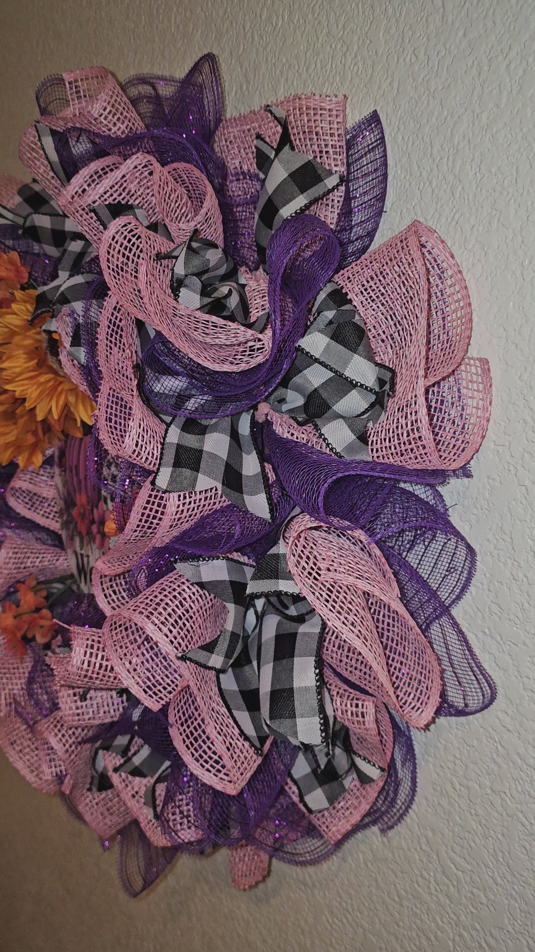 Purple and Pink Mesh Fall Wreath with Sunflowers Buffalo Plaid Pumpkin Welcome Door Decor Autumn Farmhouse Accent