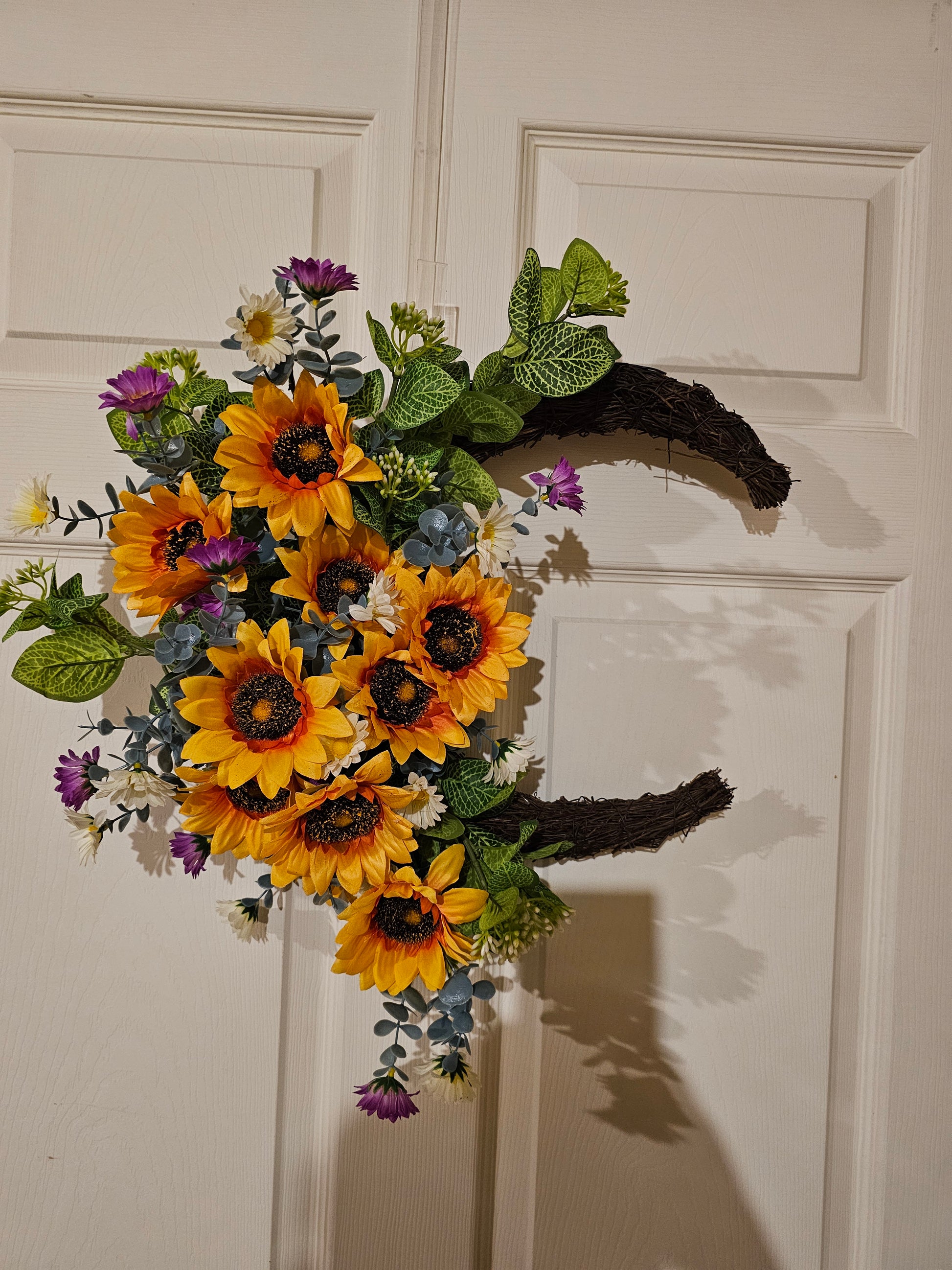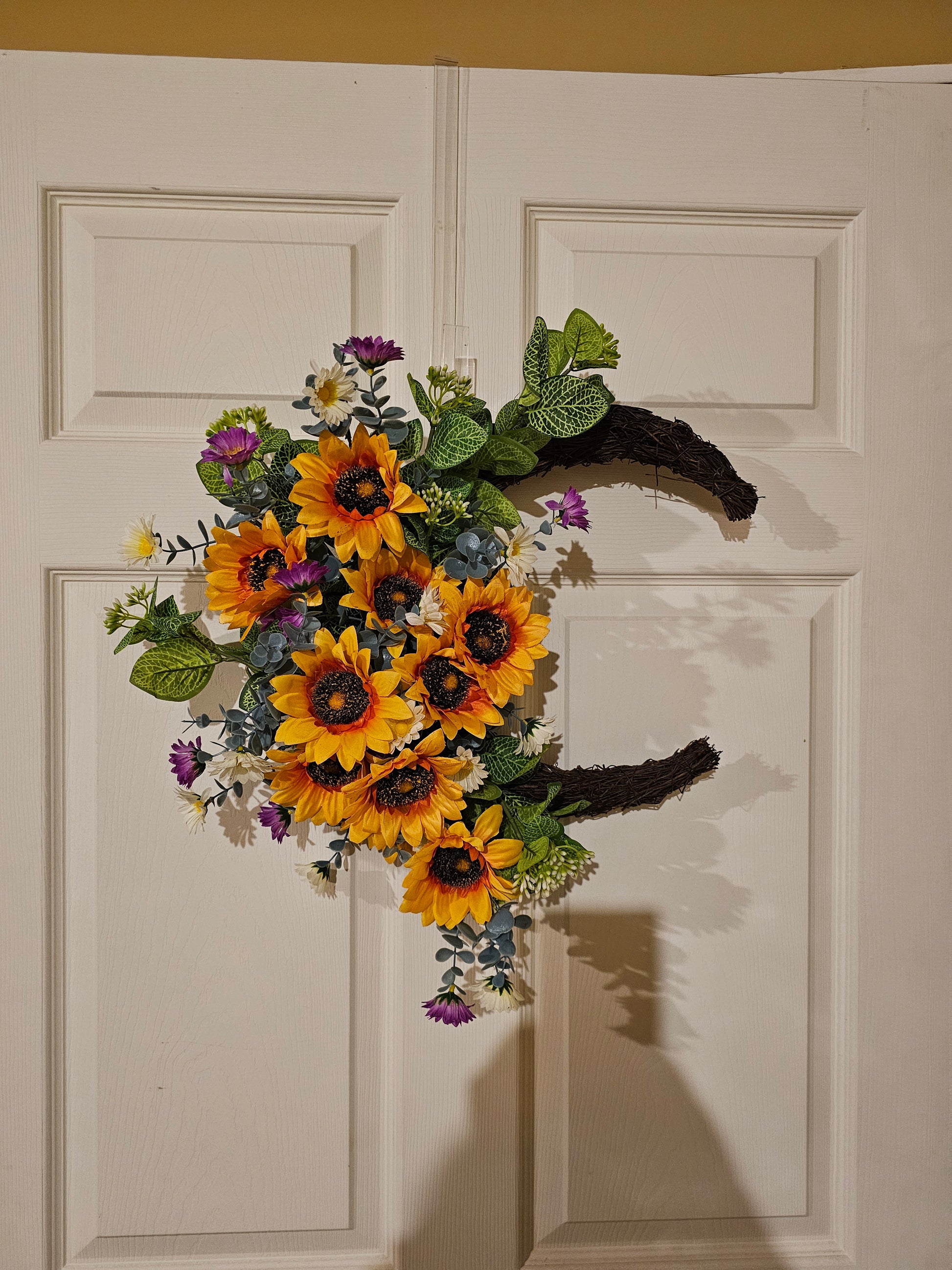 A bright sunflower wreath with meadow florals and greenery—perfect for summer and farmhouse-style homes.