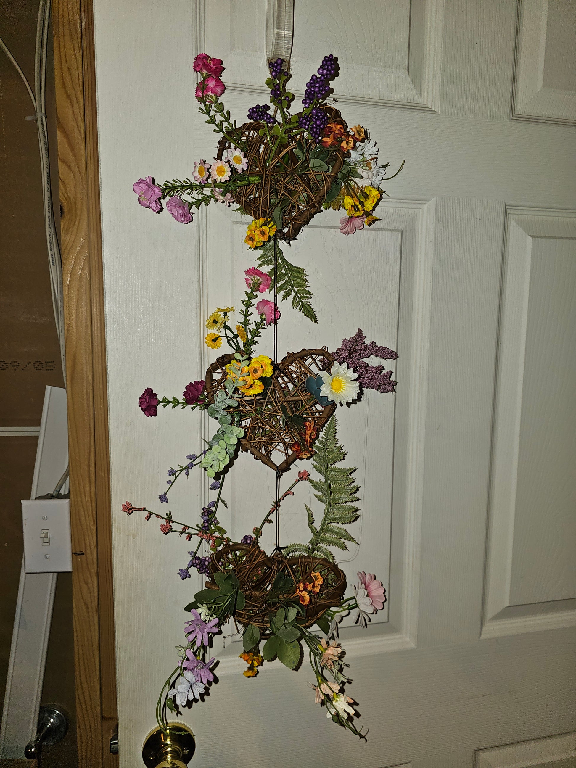 A charming vertical wall hanging featuring three woven vine baskets filled with colorful faux florals and greenery. Designed to add whimsy, texture, and seasonal charm to any door or wall.