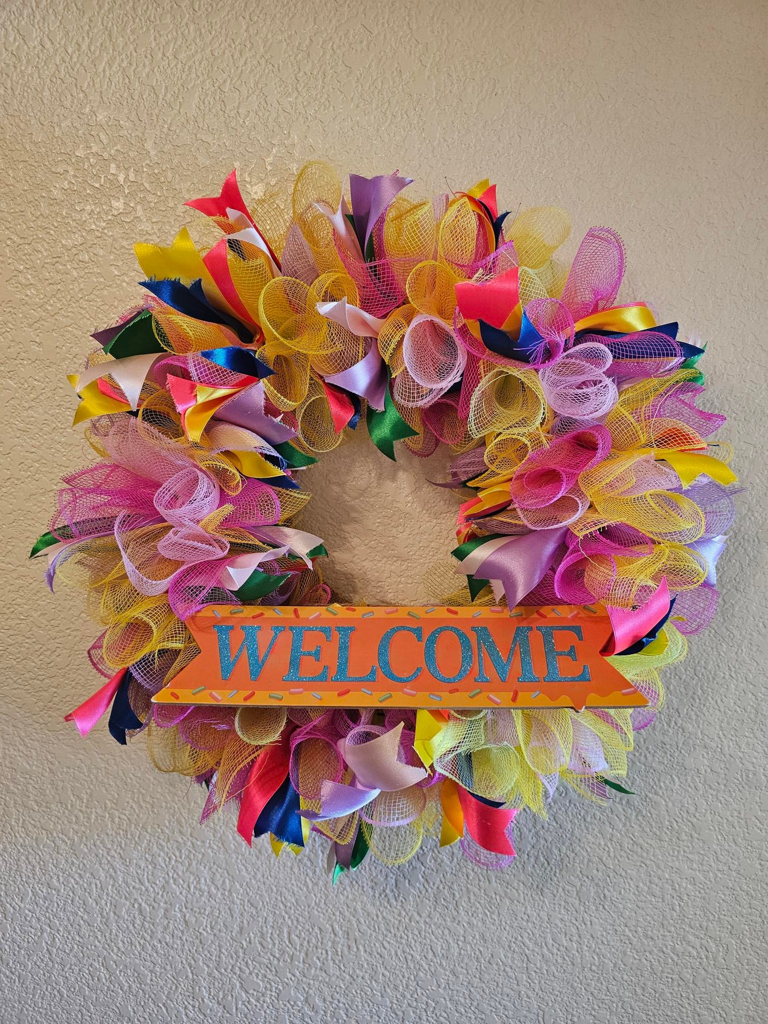 Vibrant and colorful deco mesh Welcome sign wreath. 14" Wreath