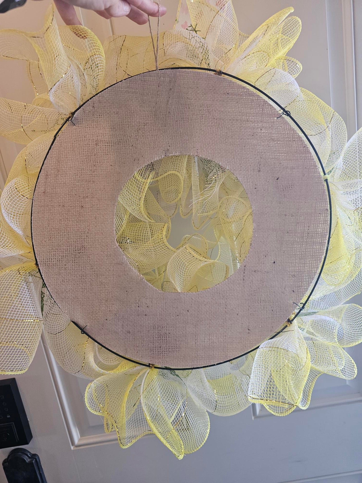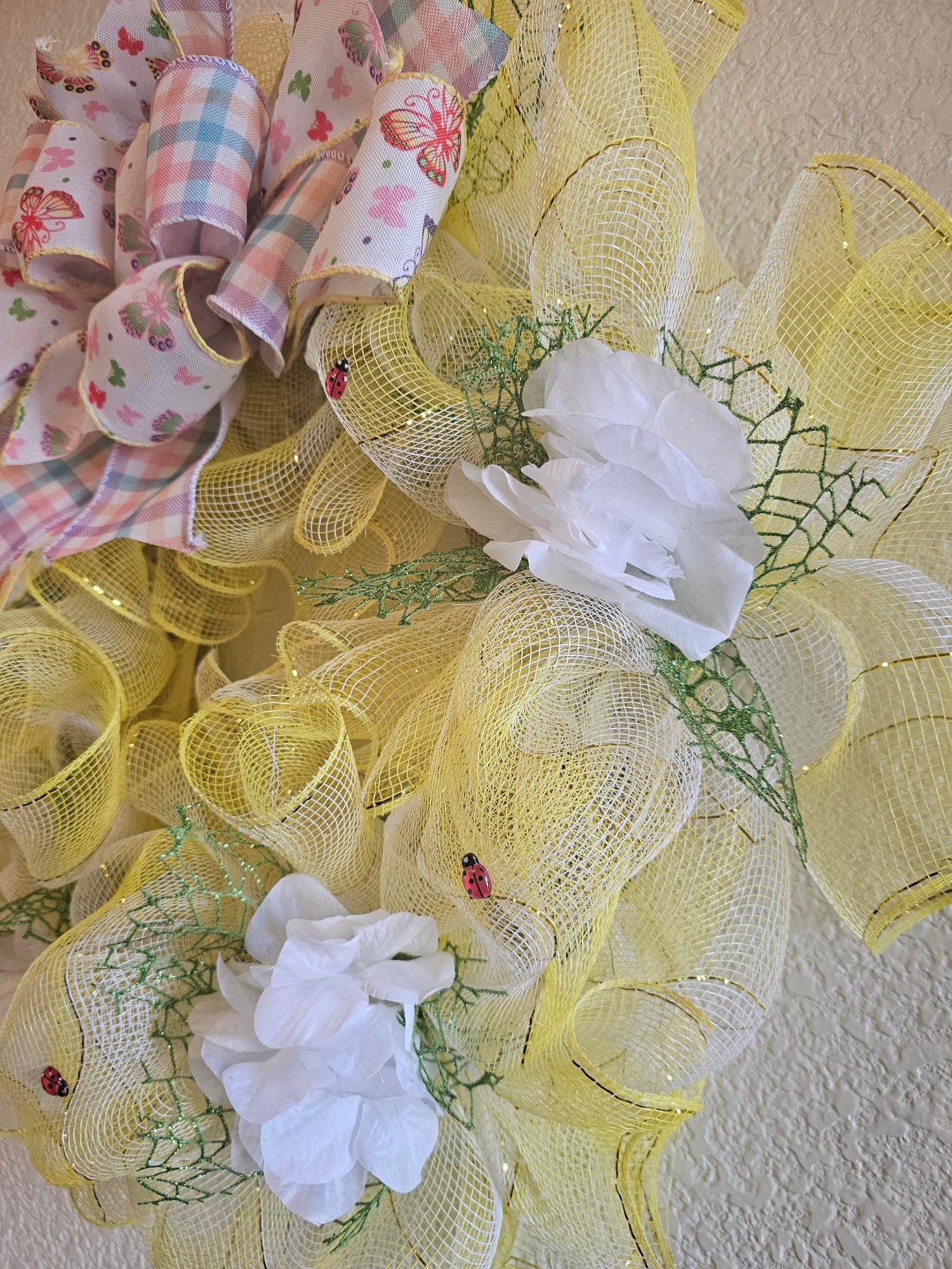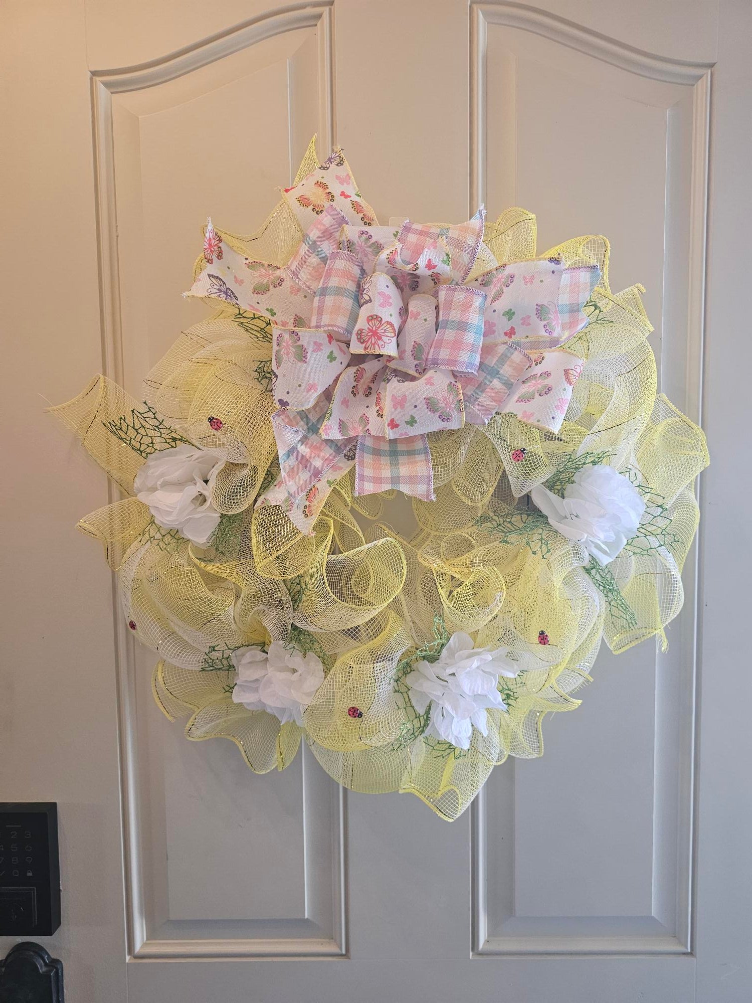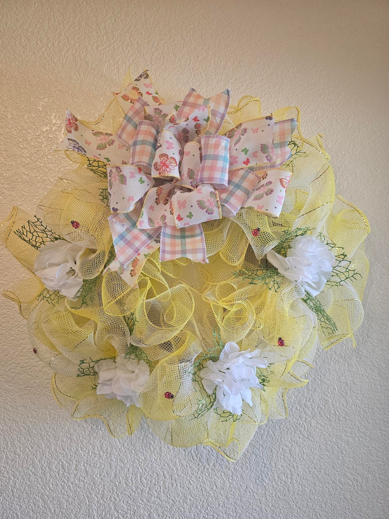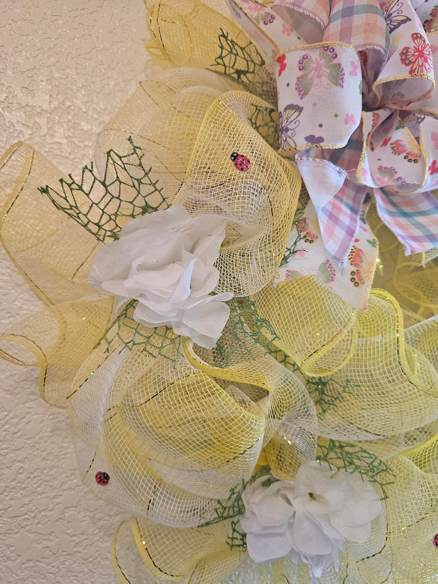 A handmade 14" butterfly wreath. Sweet whimsical details.
