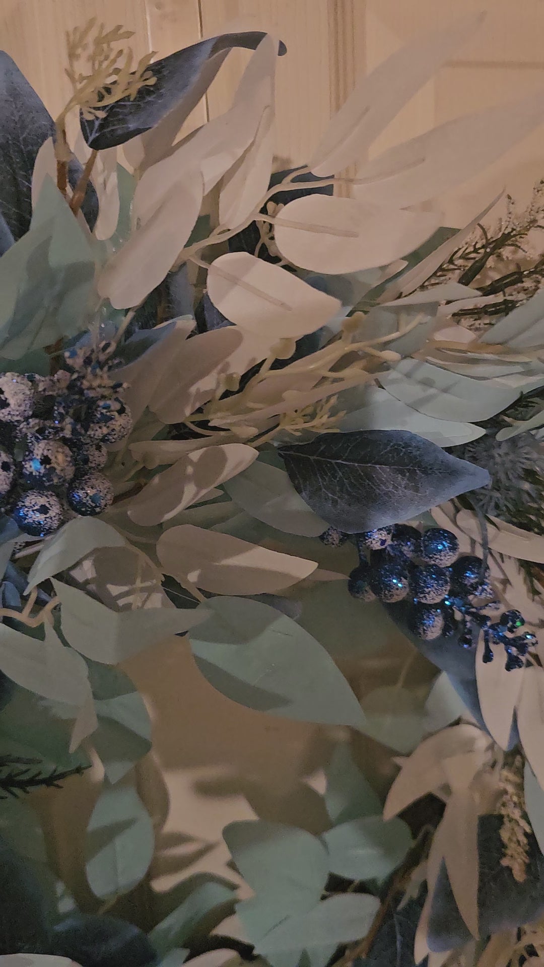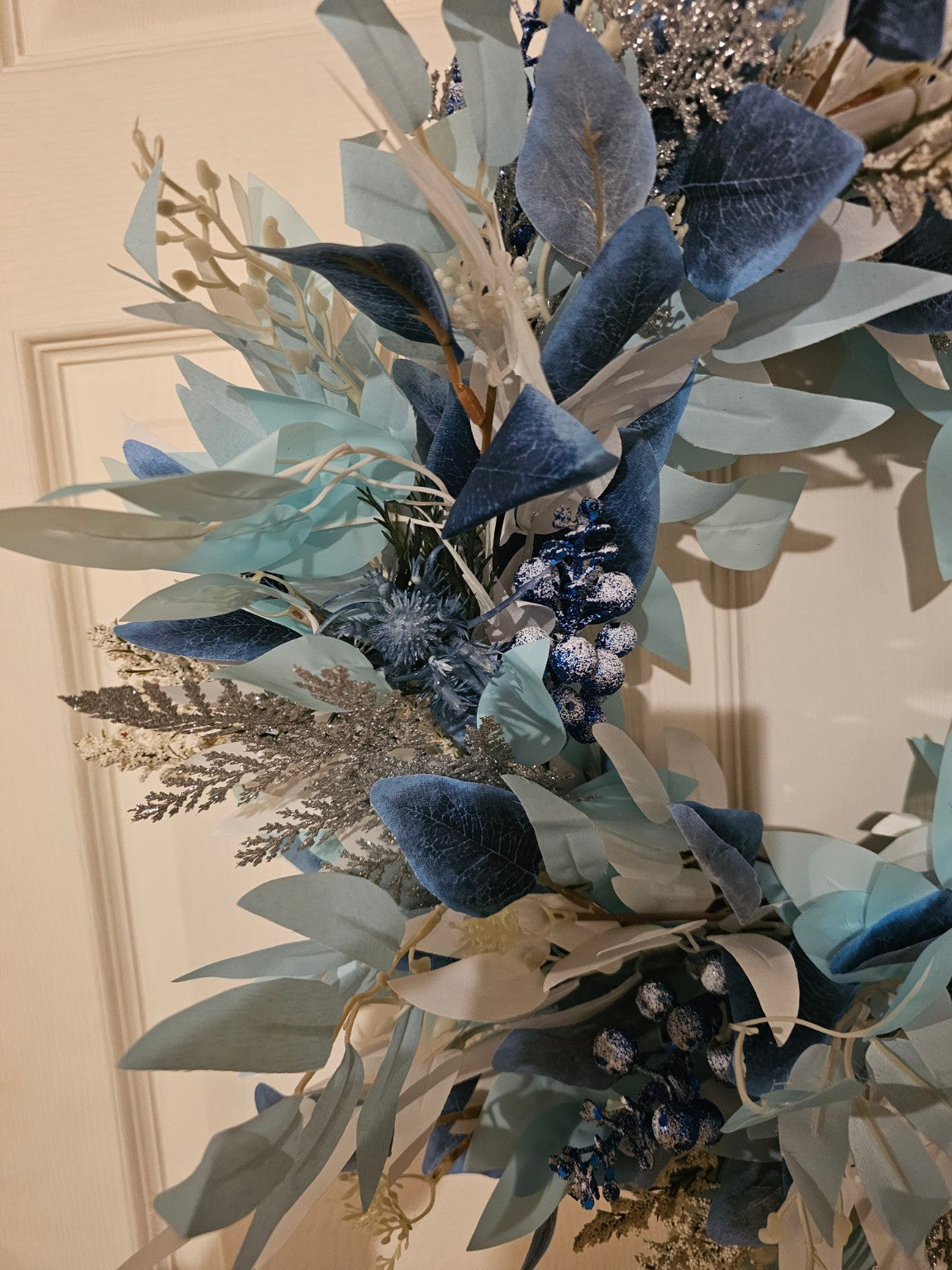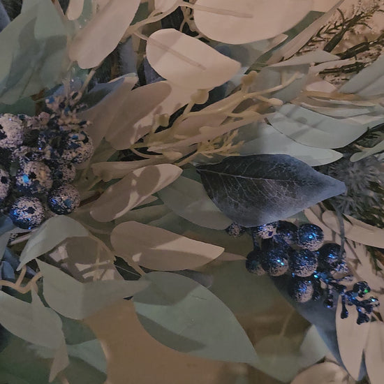 Style: Frosted winter wreath with blue, silver, and berry accents